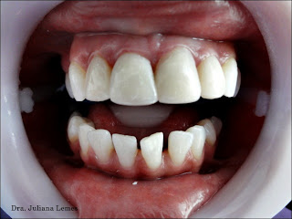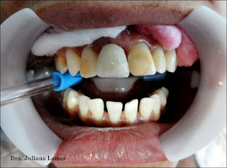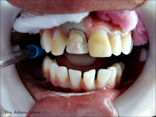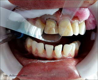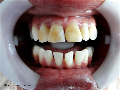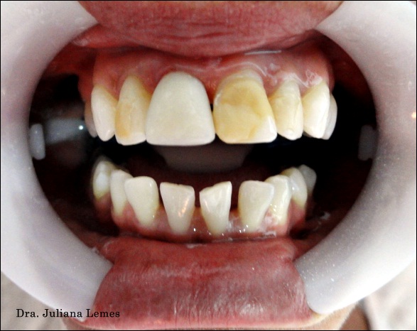 Antes, procedi com clareamento dos elementos. Os incisivos superiores permaneceram amarelos, mas expliquei que seria o passo a diminuir a sombra para qualquer procedimento restaurador que viesse posteriormente.