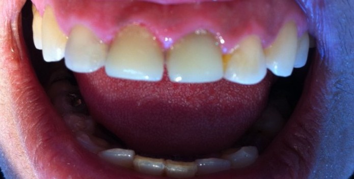 Fratura no 11 e 12 devido uma queda pela umidade nos últimos dias aqui no sul. O 21 estava um pouco pigmentado pelo tempo, mas a forma e a função permaneciam em bom estado. Depois de desgastar toda vestibular do 11 e confeccionar uma nova faceta em resina, aproveitei pra realizar um desgaste de leve na pigmentação dos outros dentes. O resultado foi esse:
